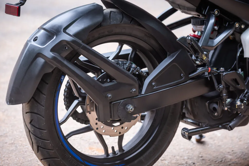 A Bajaj Dominar 200 ainda vem equipada com cavalete central, mas ao rodar com garupa é preciso ficar atento nas curvas, pois o cavalete chega a raspar no chão, por isso se você roda muito com garupa é bom adequar a pré carga da mola do amortecedor traseiro da sua jóia. A rabeta com banco bipartido evoca o dom esportivo e proporciona conforto para a garupa, que tem duas alças de alumínio para segurar.
