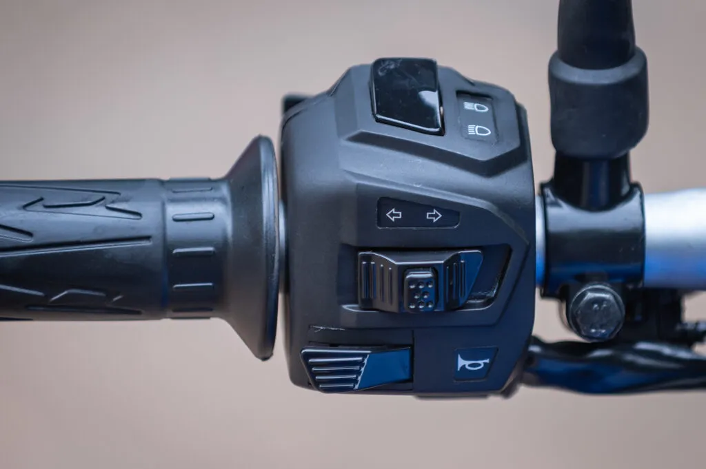 Acessório bem legal e descolado é o protetor tipo mata cachorro em duas partes e com uma super útil trava de capacete no lado direito. O semi-guidão tem uma pegada bem neutra e confortável, mas não consegui regular a altura dos manetes, pois eles ficam travados em conjunto com os punhos retroiluminados que são bem legais durante a noite.