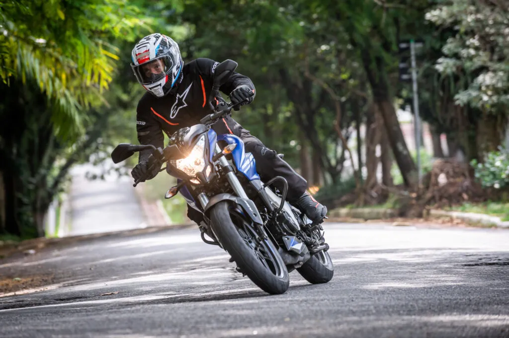 O conjunto mostrou que é capaz de enfrentar o asfalto com bastante harmonia e progressividade, permitindo até uma tocada esportiva com um feedback bastante positivo da moto. É bem perceptível e prazeroso o bom funcionamento da máquina contornando curvas, com estabilidade e segurança acima da média da categoria.