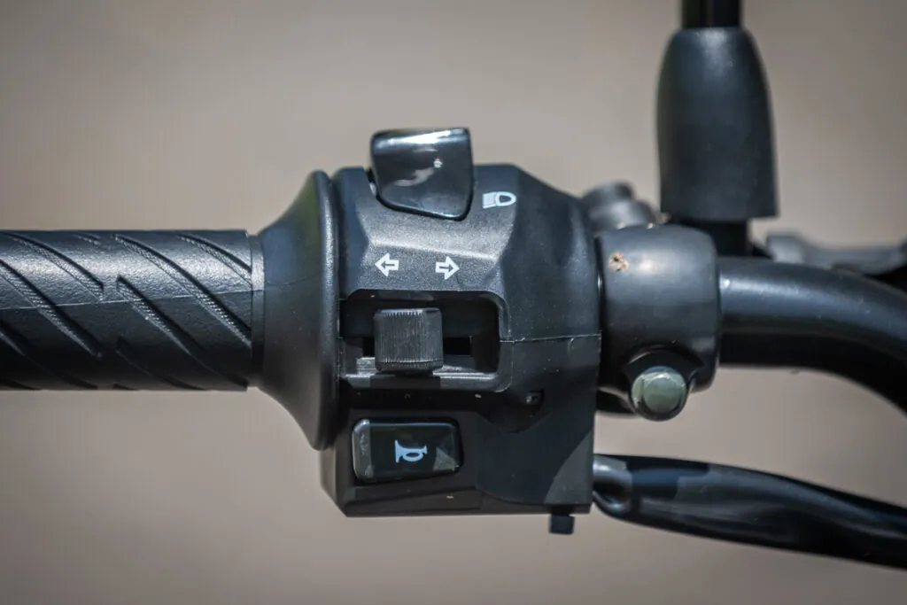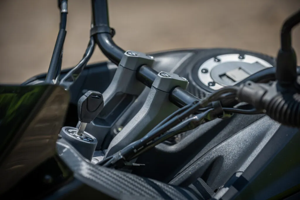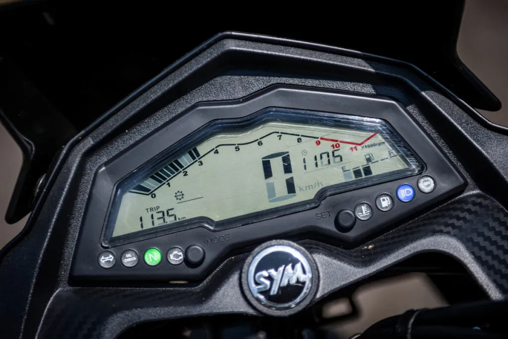 O banco relativamente baixo e a proximidade do guidão até o piloto, faz parecer que o cockpit é pequeno, mas aposição é bem relaxada e você anda com os braços semiflexionados, para meus 1,80 metros de altura, precisaria regular um pouco o guidão.
