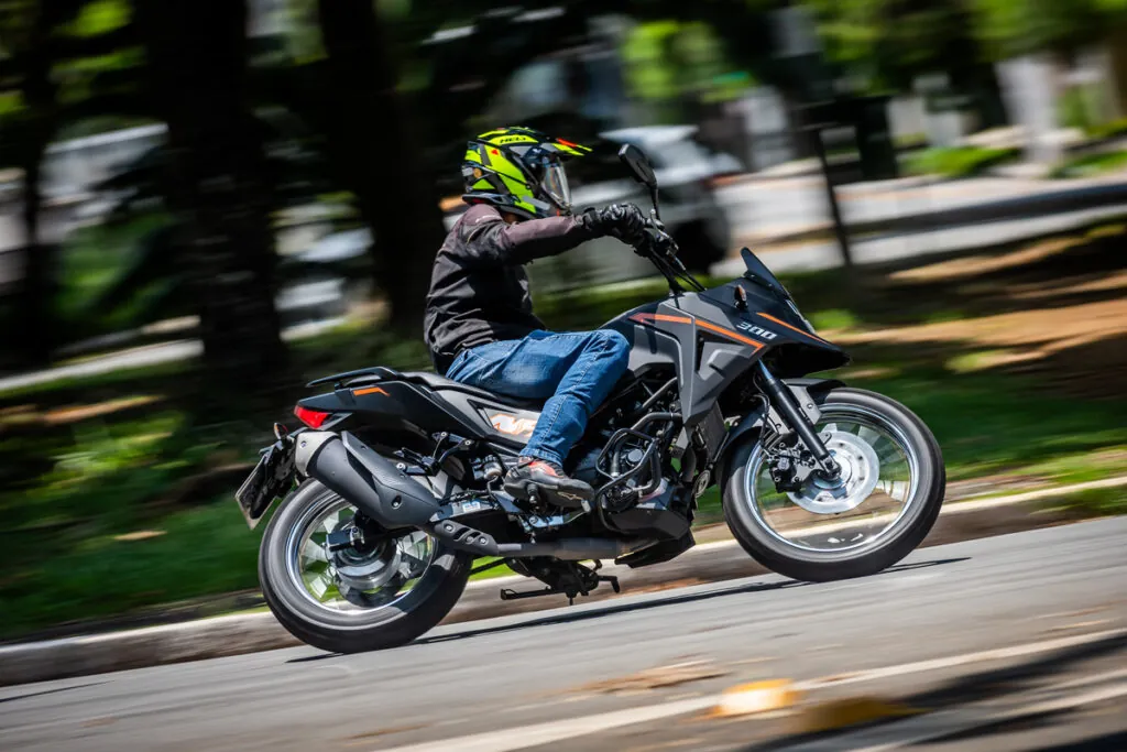 Este motor é dos mais modernos e, juntamente com o da Zontes T310, são os únicos com refrigeração líquida na categoria. A NH 300 tem ótima desenvoltura no trânsito, com arrancadas rápidas, usando pouco do acelerador para manter o fluxo do trânsito. As médias de consumo na cidade e estrada ficaram em 30 km/l.