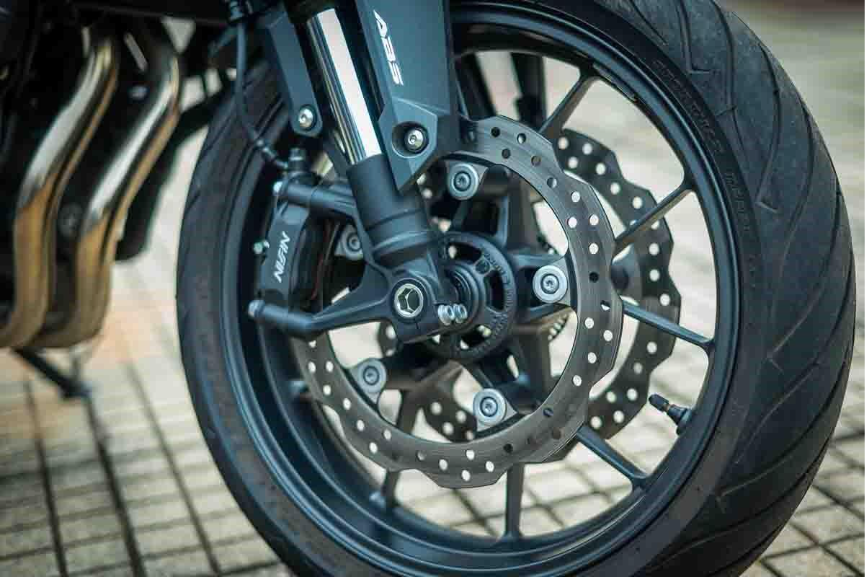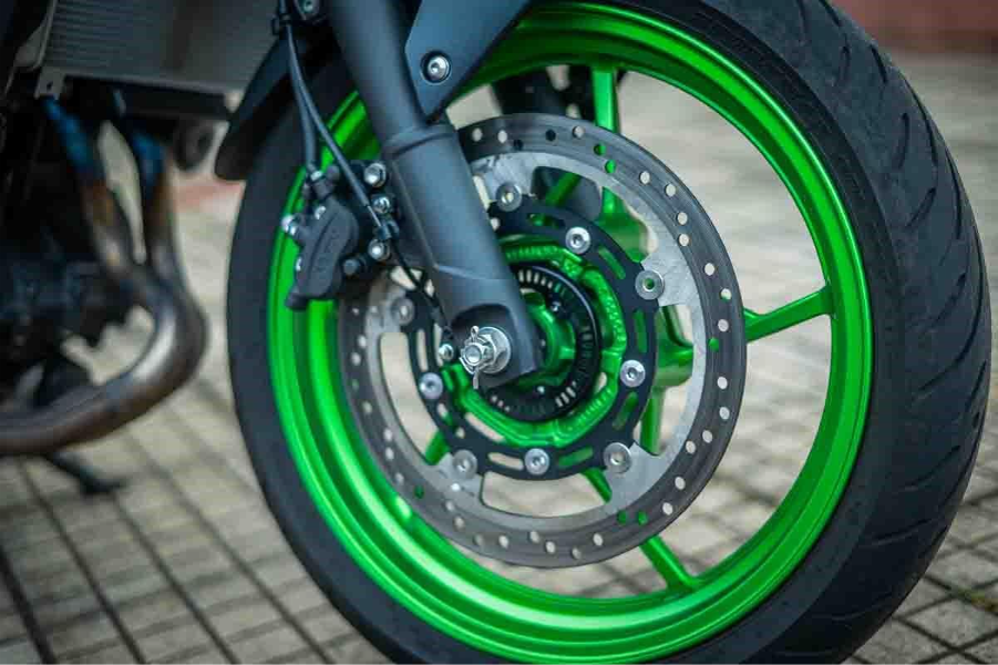 A Kawasaki Z500 mantém uma receita conservadora: garfo telescópico convencional e disco único de freio na dianteira. O conjunto funciona bem para o peso da moto, mas em uma pilotagem agressiva ou com garupa, o sistema da Honda é nitidamente superior em termos de feeling e resistência ao superaquecimento.