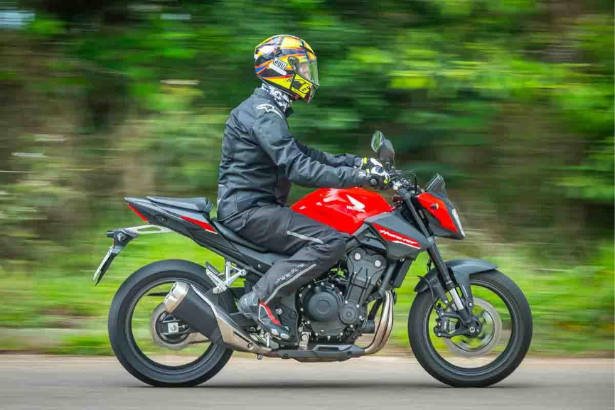 - Na Honda Hornet, o piloto encontra uma posição neutra. O triângulo entre guidão, assento e pedaleiras foi desenhado para que você possa rodar 500 km num dia sem precisar de um fisioterapeuta no dia seguinte. O guidão é mais largo e próximo do corpo, permitindo um braço de alavanca que facilita manobras em baixa velocidade.