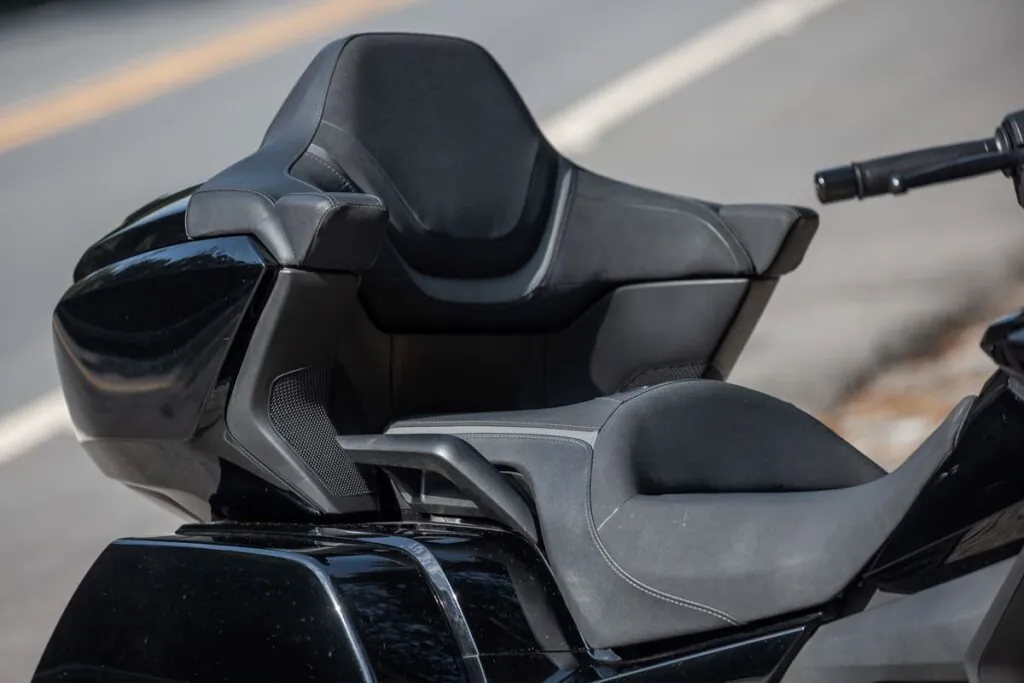 Ao subir na moto, minha mente é estimulada pelo banco baixo que ajuda a ter confiança parado ou nas manobras em baixa velocidade. A qualidade no acabamento também é de primeira. Os engenheiros japoneses projetaram a nova Gold Wing com o claro objetivo de torná-la mais magra e fácil de pilotar, e tiraram peso de quase tudo.