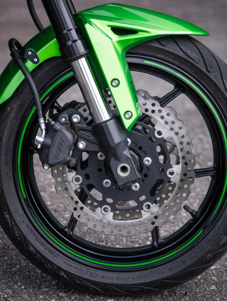 O sistema de frenagem tem disco duplo na dianteira mordido por pinças Nissin convencionais deslizantes de dois pistões e na traseira um disco simples com pinça de pistão único, ambos com ABS. São bem potentes e de ótima pegada inicial para rodar na cidade, bem como para frenagens mais fortes na tocada mais agressiva.
