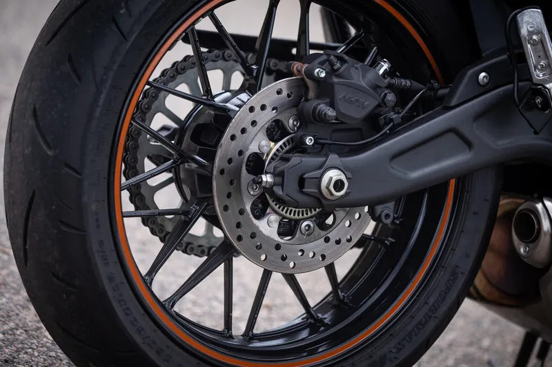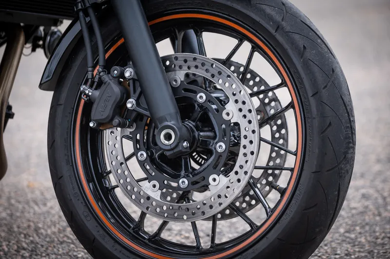 O sistema de freio da RS só difere no formato dos discos, nesta neoclássica eles não têm o formato “wave” como na Naked moderna.