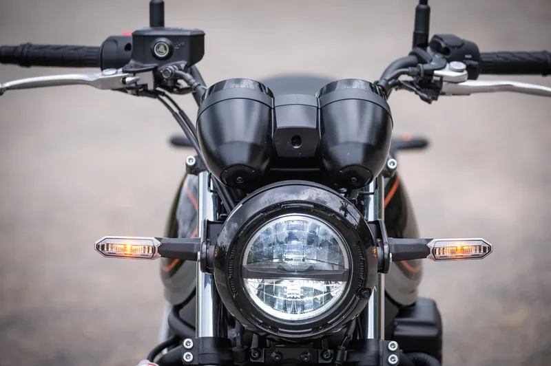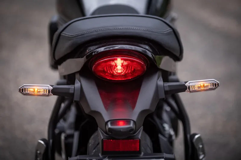 O emblema com o nome da fábrica também evoca aquele utilizado nos anos 1970. O farol redondo, característico das motos da época, logicamente foi modernizado com a iluminação por LED, assim como na pequena lanterna traseira embutida sob o banco e seus piscas.
