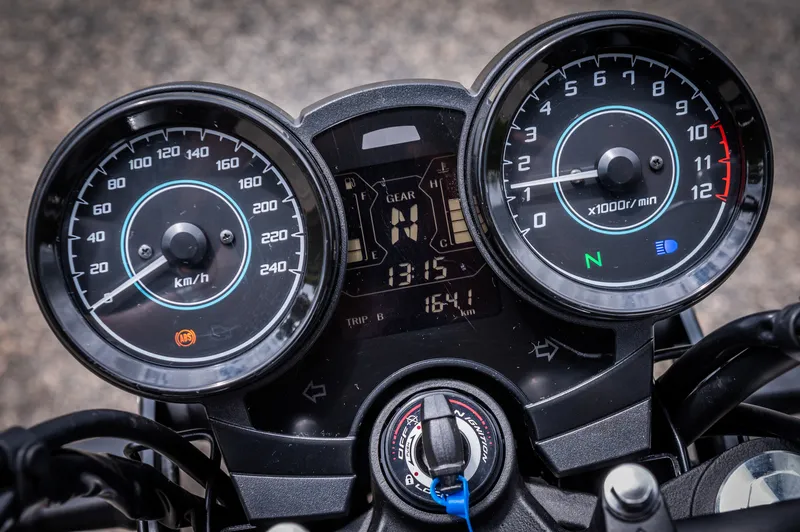 O painel com dois mostradores analógicos redondos também vem do passado, mas as informações digitais ao centro trazem as informações de praxe de hoje em dia, ele é elegante e bastante funcional.