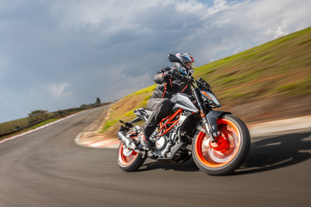 O motor da KTM 390 Duke tem 373,2 cilindradas, duplo comando no cabeçote para acionar as quatro válvulas, injeção eletrônica de combustível e refrigeração líquida. A potência é de 44 cv e o torque é de 3,8 kgf.m. O câmbio de seis marchas é muito bem aproveitado pela ampla faixa de rotação até as 10.000 rpm, por isso você estica as marchas e troca rapidinho. O acelerador eletrônico ride-by-wire refina as respostas do motor e ajuda a economizar combustível e a diminuir as emissões de escapamento. O motor é esperto demais, ele é arisco e mal educado intencionalmente, ronca alto e empurra com vontade sem sentir falta de fôlego ou cansaço, e ainda encoraja você subir o giro e arrancar a última gota de potência e torque dele.