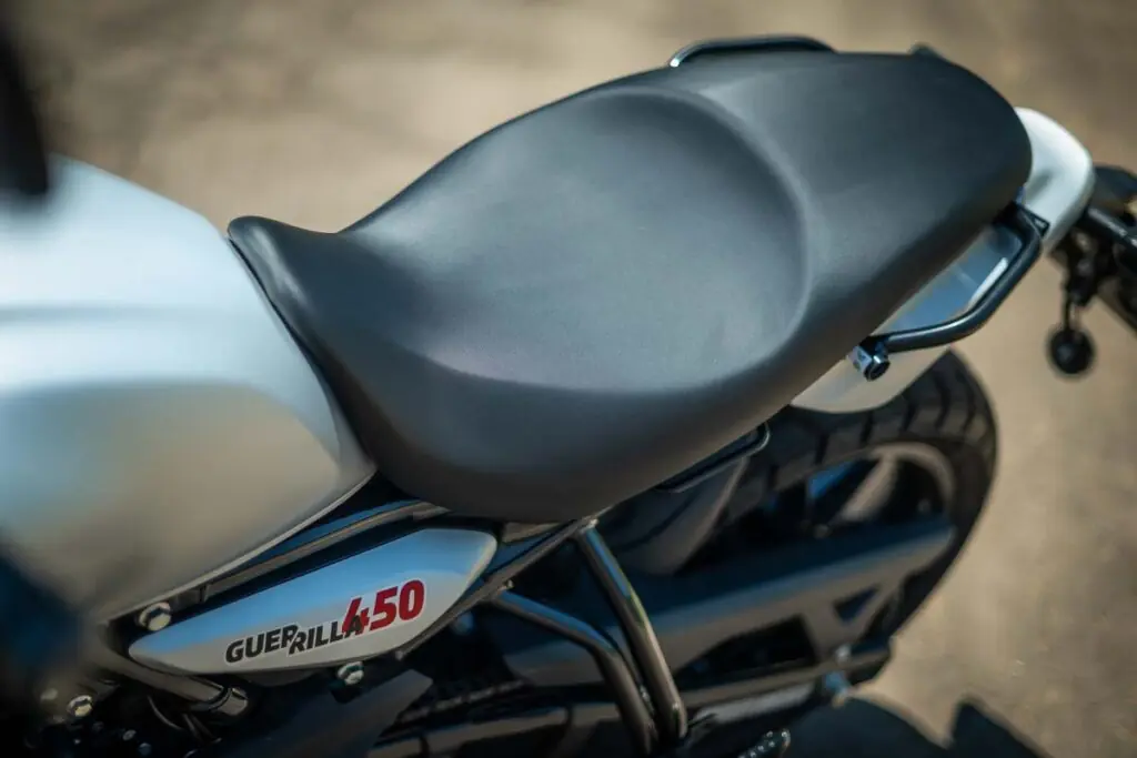 A ergonomia é onde a Royal Enfield Guerrilla 450 realmente brilha para o uso diário. O triângulo formado pelo assento baixo, (a 780 mm do solo), guidão e pedaleiras, permite um encaixe natural e relaxado. Você sente que pode passar horas sobre a moto sem fadiga, o que a torna uma excelente companheira para viagens médias. O painel TFT circular, compartilhado com a Himalayan, é um espetáculo à parte, oferecendo espelhamento do Google Maps que facilita a navegação real sem a necessidade de suportes extras para celular.