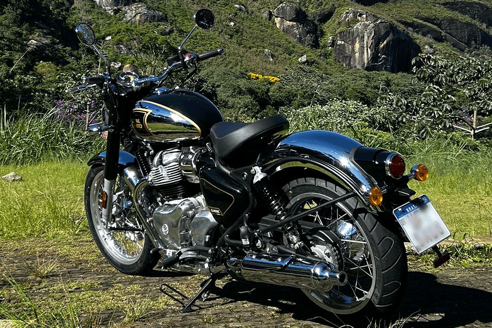 Nesse contexto, a linha Classic é a que melhor representa essa herança. O modelo traz um design inspirado nas Bullet da década de 1940, com construção robusta em metal, posição de pilotagem confortável e foco em no motor com bastante torque, características marcantes da identidade da marca.