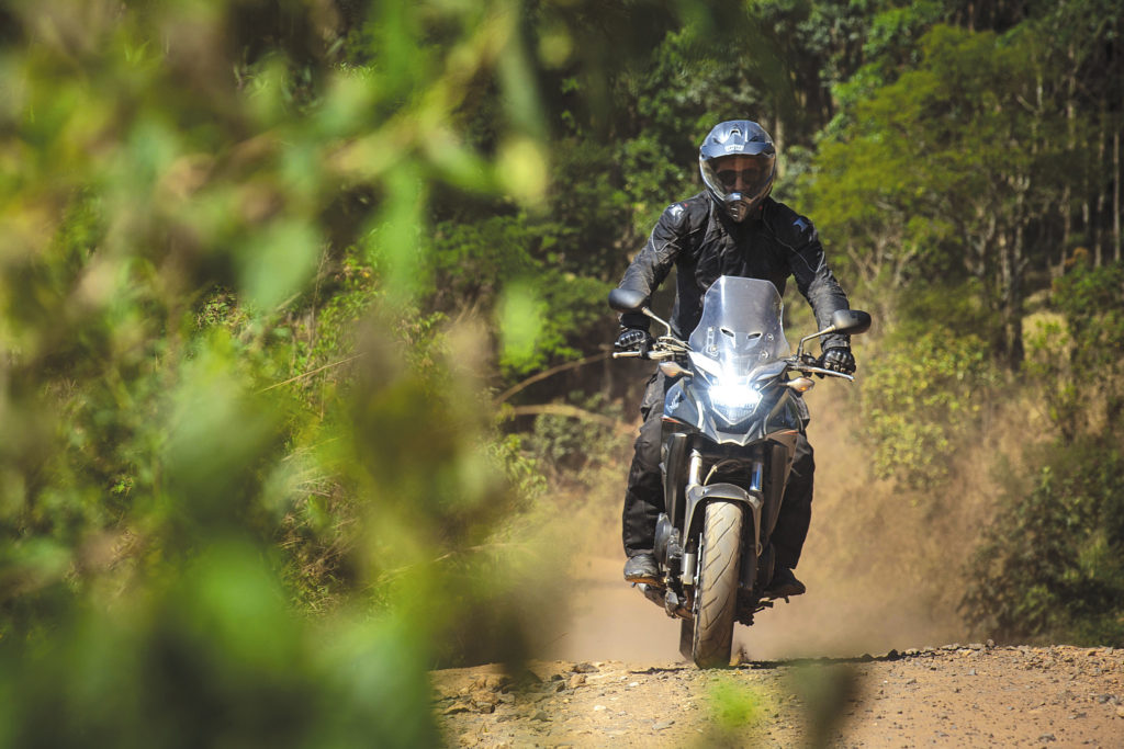 Com a pré-carga suavizada, percorremos cerca de 40 quilômetros de estrada de terra com subidas e descidas, areia e muitas pedras soltas. A suspensão trabalha bem com o ajuste certo, mas a roda 17” na dianteira novamente mostra que não gosta muito desse tipo de uso. Pilotando sem abusar ela vai tranquila, porém, exige muito mais atenção que em motos com aros maiores.