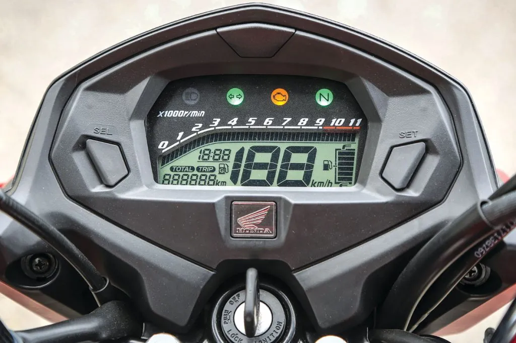 O painel digital com conta-giros ajuda a buscar melhor rendimento, mantendo a moto na zona de rpm de maior torque e potência — pela nossa medição no dinamômetro, entre 5 000 e 7 310 rpm. Para quem quer economizar no consumo, o mesmo conta-giros serve para monitorar se você não está pesando a mão no acelerador. Andando dentro da cidade, sem garupa, poucas vezes passamos dos 5 000 rpm.