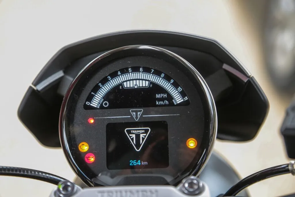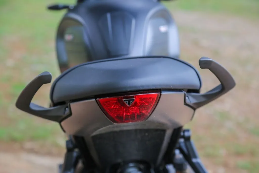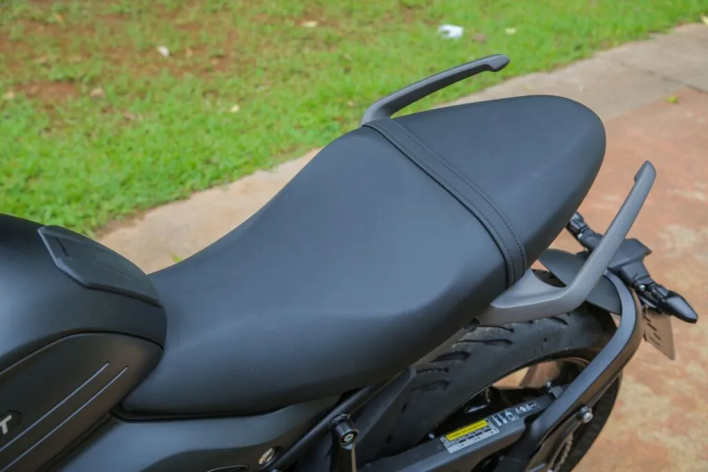 Visualmente a Trident 660 já parece “pequena”. Ela é bem compacta, basta montar sobre ela para confirmar o bom encaixe entre assento, pernas e braços ao guidão, oferecendo uma posição de pilotagem bastante confortável. A altura do assento de 805 mm oferece mais segurança para apoiar os dois pés no chão, inclusive para os mais baixinhos. A boa ergonomia, aliada à suavidade dos controles, faz com que ela se comporte muito bem.