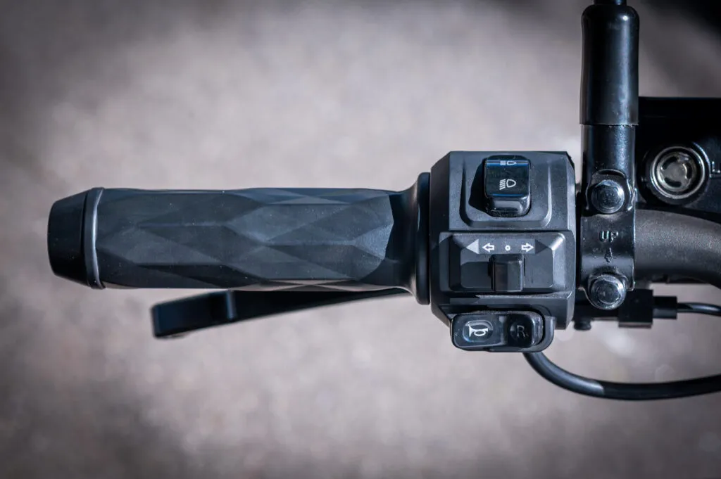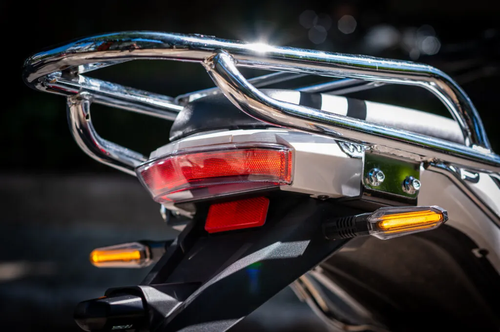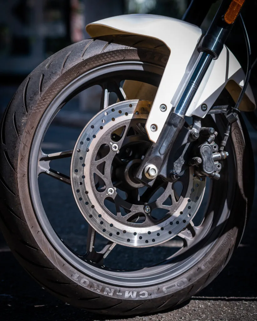 O sistema de freios é combinado, conta com disco simples na dianteira e na traseira e se mostraram bem eficientes para a proposta da moto, afinal, para rodar a trabalho as velocidades devem ser mais moderadas. Detalhe bem legal é que os dois freios são acionados no guidão, com o dianteiro sempre na mão direita, e o traseiro na mão esquerda, e as alavancas são em alumínio e tem regulagem de altura.